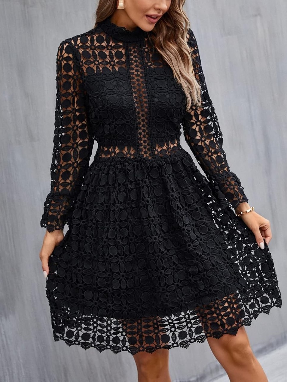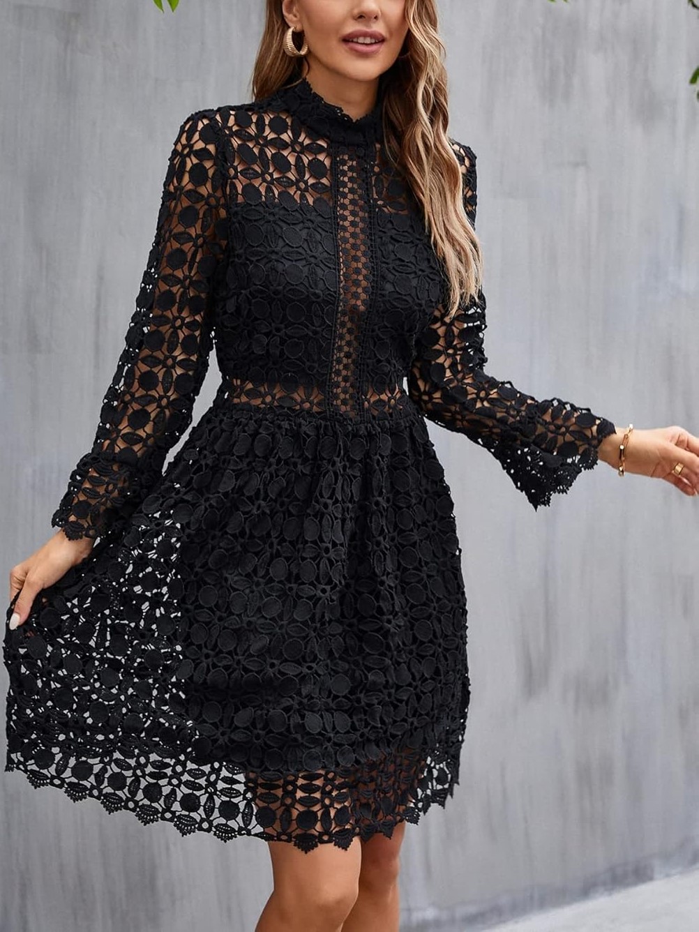 HOT SALE Women's Stand Collar Lace Hollow-Out Floral Pattern Dress