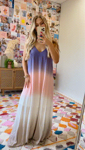 Ombre this way in this super cute and colorful maxi dress! It's a v-neck maxi dress with spaghetti straps. It is lined to the knee and super lightweight. Wear it with sandals or wedges and a cute straw hat for a trip to the boardwalk, Fit is true.