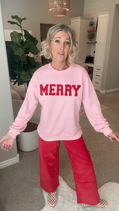 - Clean Crew Neck Silhouette: The minimalist design ensures versatility, allowing you to dress it up or down while keeping the focus on the effortless “merry” statement.