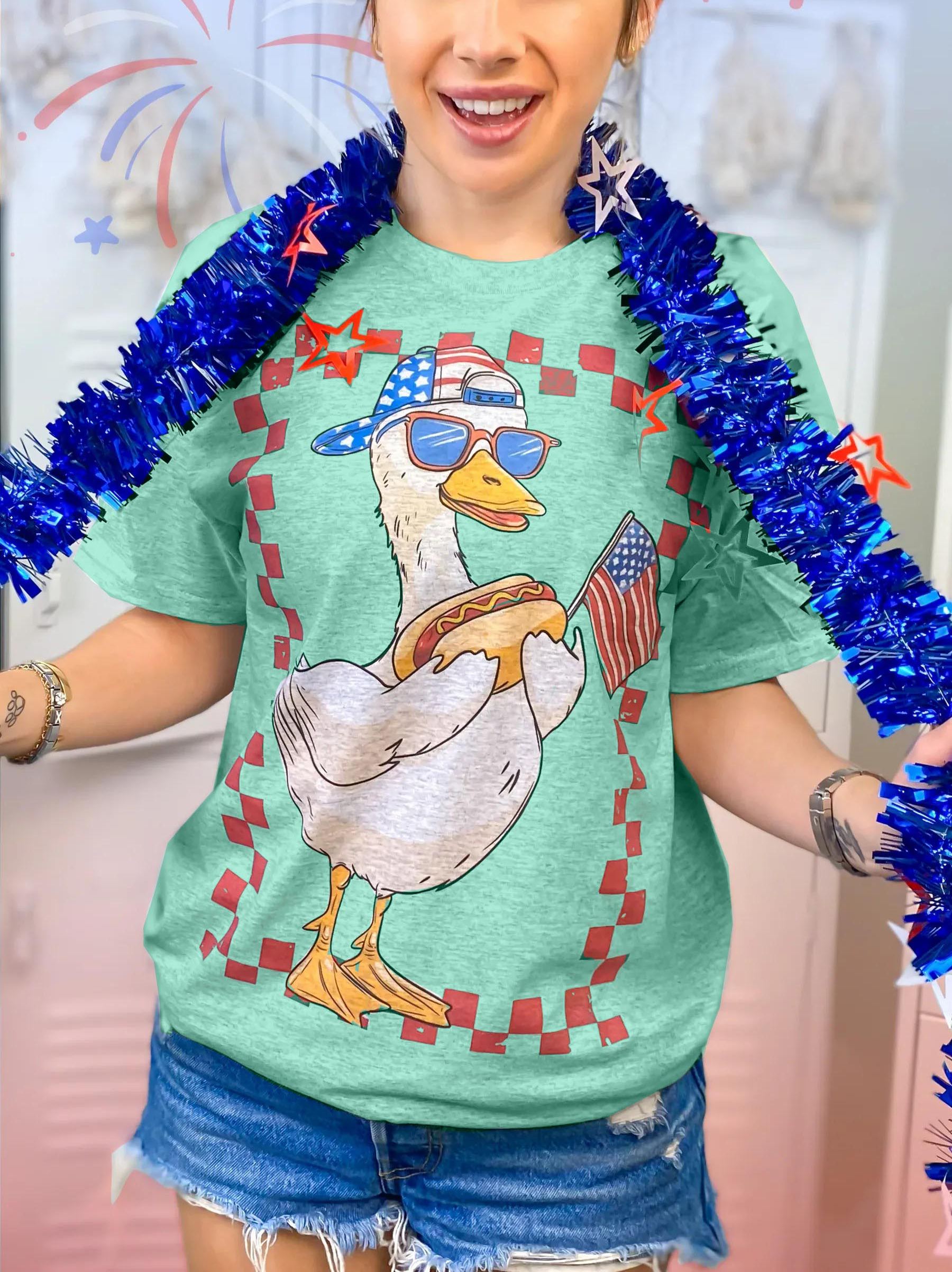 This graphic t-shirt's design features an illustration of a cool goose wearing sunglasses and a backward hat, holding a hot dog and American flag, and surrounded by a red checker border. This top is perfect for Independence day or any patriotic American holiday!