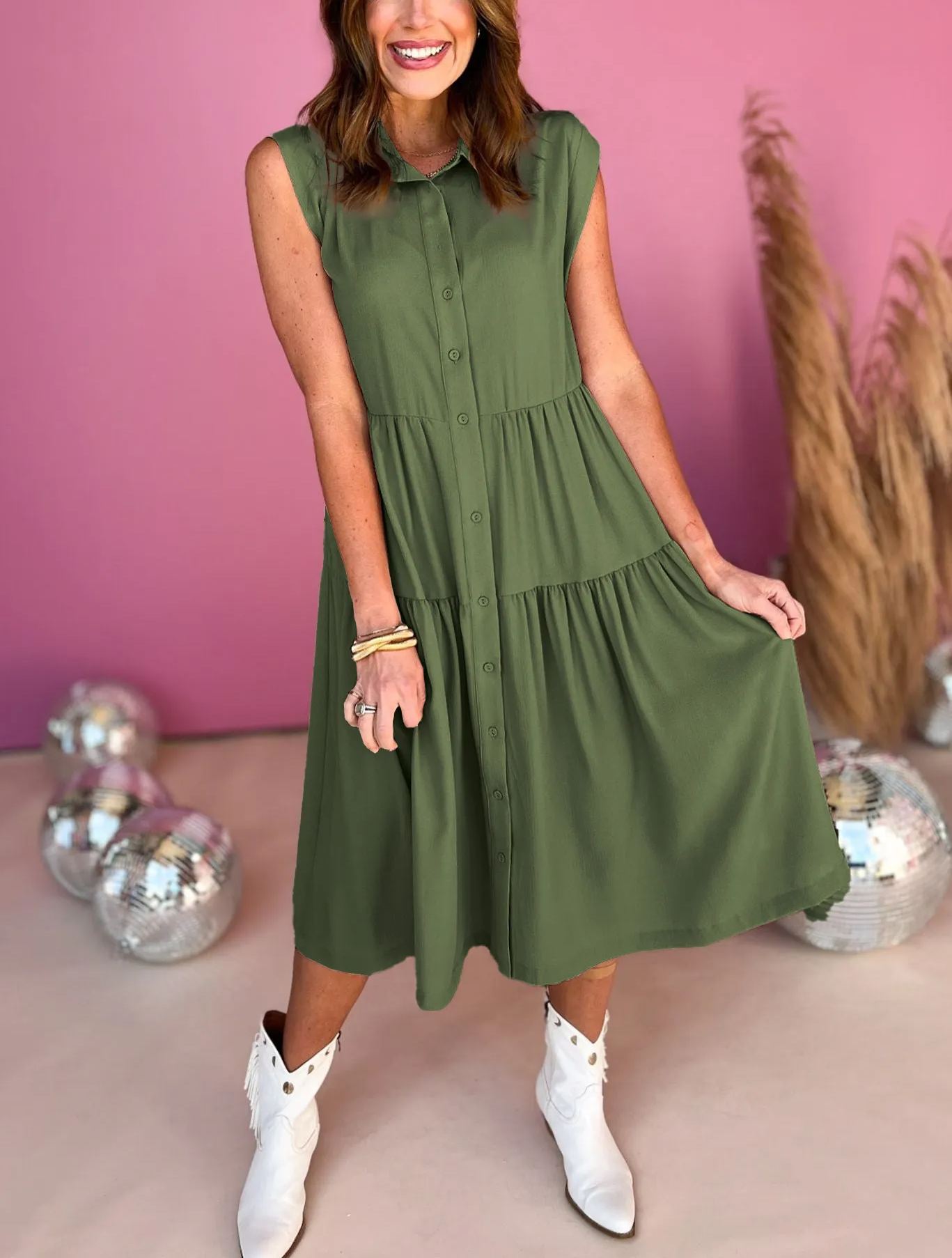 Introducing our Textured Collared Button Down Sleeveless Midi Dress. This versatile dress is perfect for any occasion and effortlessly combines style with comfort. The collared neckline adds a touch of sophistication, while the textured fabric gives it a little something extra. This is a must-have wardrobe staple