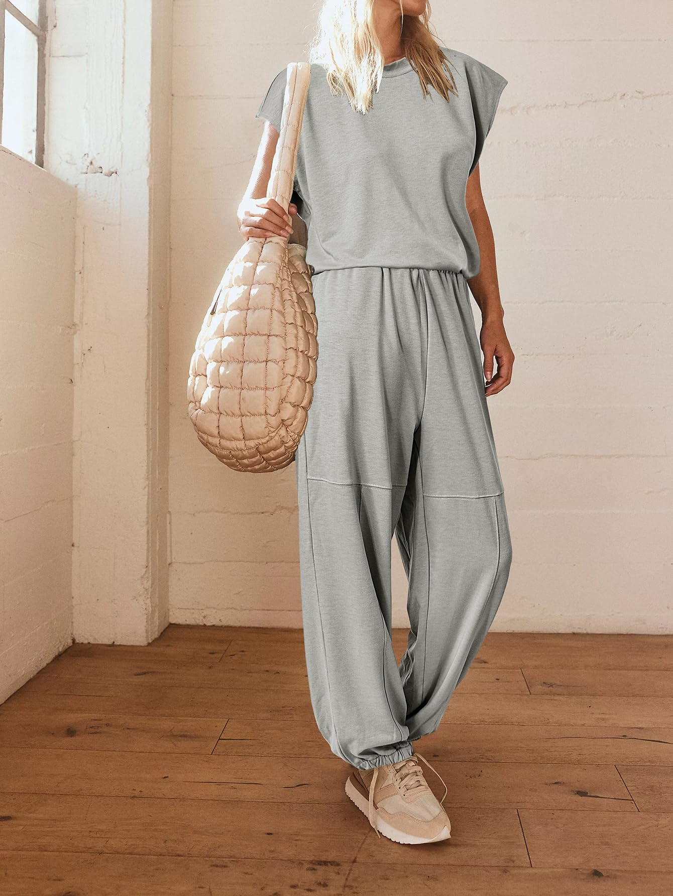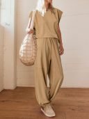 Sleeveless Sports Top Features an Oversized Fit, Paired with a Colorful Sports Bra for a Comfortable, Casual Look. Sports Trousers are Suitable for all Body Types.