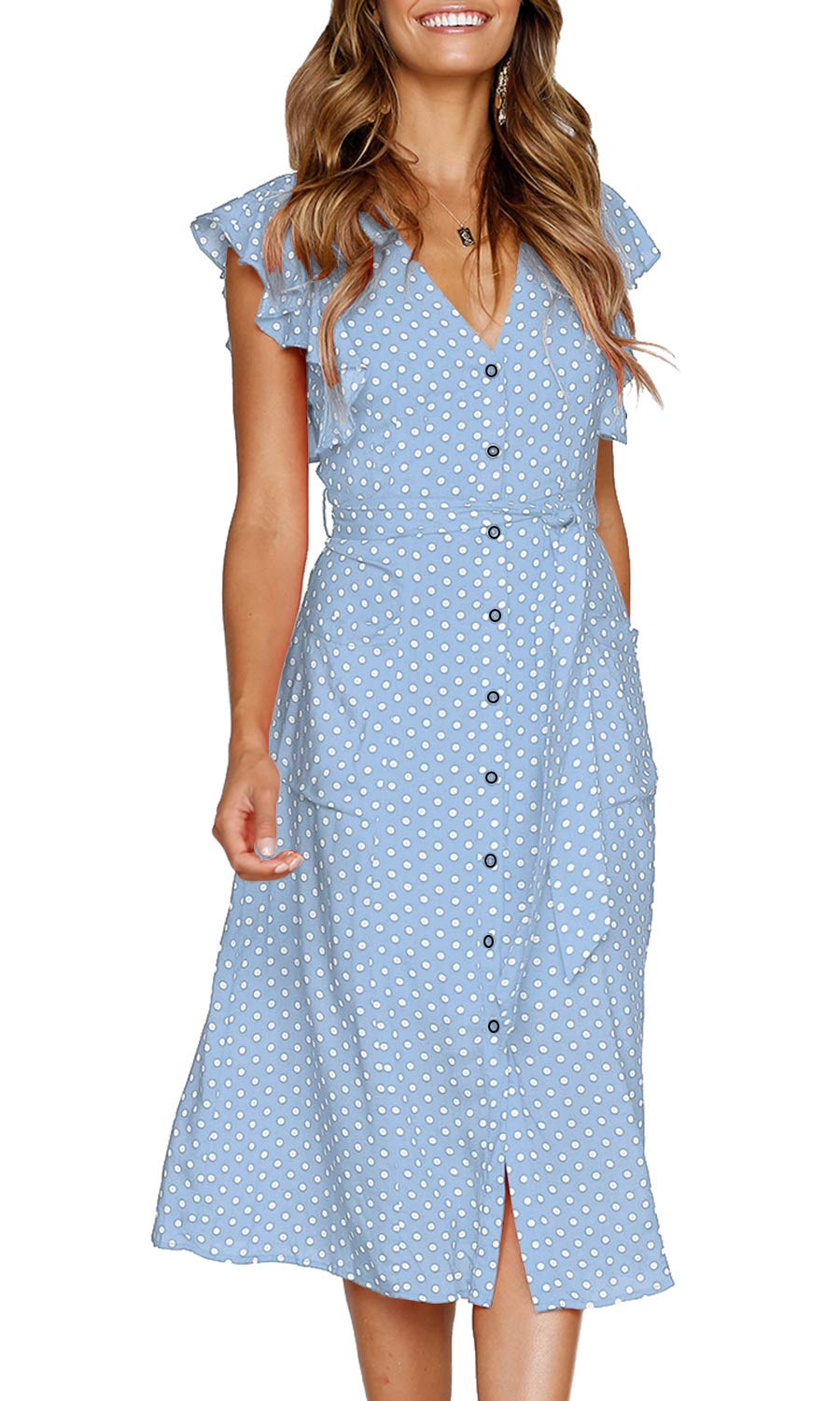 Classic meets contemporary in our Polka Dot Dress. Featuring a timeless polka dot pattern, this dress is designed with a flattering V-neckline and short sleeves. The button-down front and convenient pockets add a practical touch to this stylish piece. Whether you're heading to a brunch or a casual day out, this midi dress promises both style and comfort.