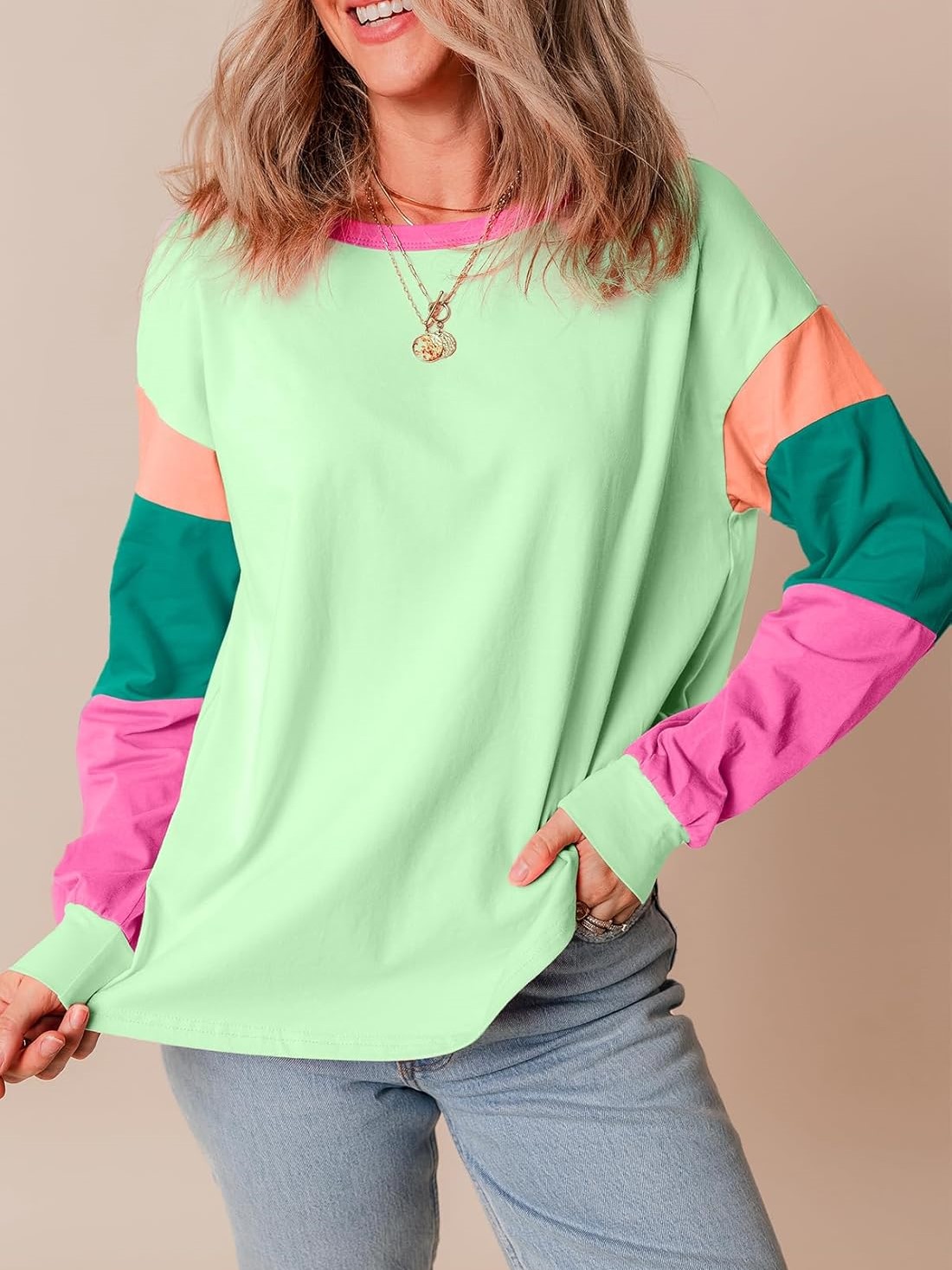 ✨This is the perfect basic color block pullover! 🌈Effortlessly stylish, this top combines casual charm with trendy color blocking, perfect for a laid-back yet fashionable look.