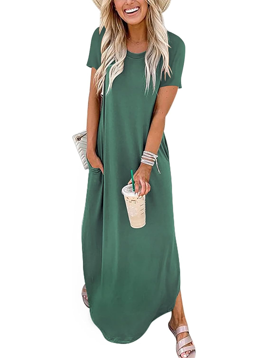 Stay cozy with our Maxi Short Sleeve Dress — where casual meets sophistication. From brunch to sunset strolls, this dress has you covered. The side slit adds a flirty detail, making it perfect for beach vacations or casual outings. Crafted with pockets for practicality, this dress is a must-have for your summer wardrobe.