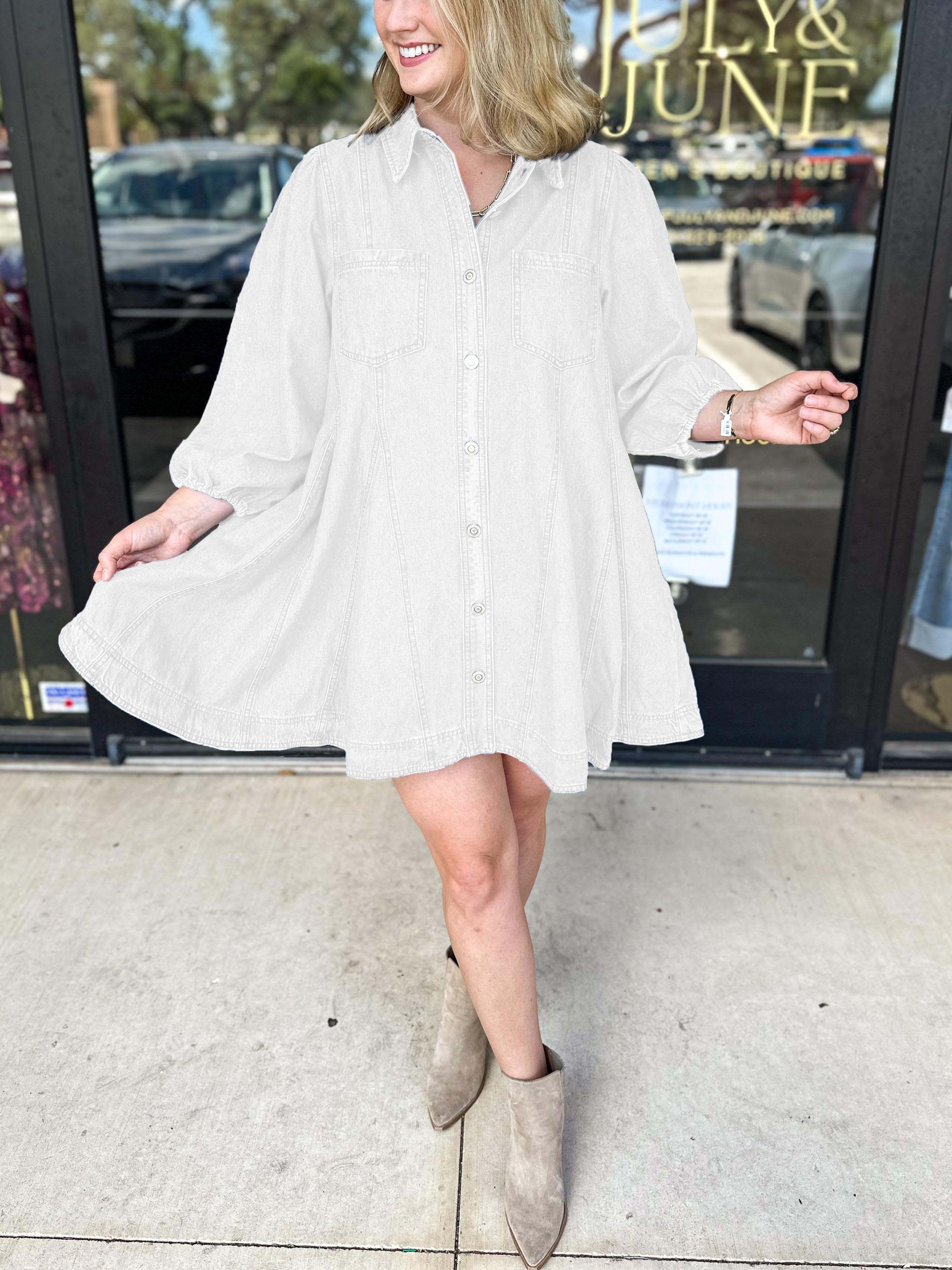 Get ready to turn heads in the Denim Mini Dress! This flowy denim dress is perfect for any fun night out with friends. Dress it up for a night on the town or keep it casual for a laid-back look. No matter how you wear it, you'll be the life of the party!