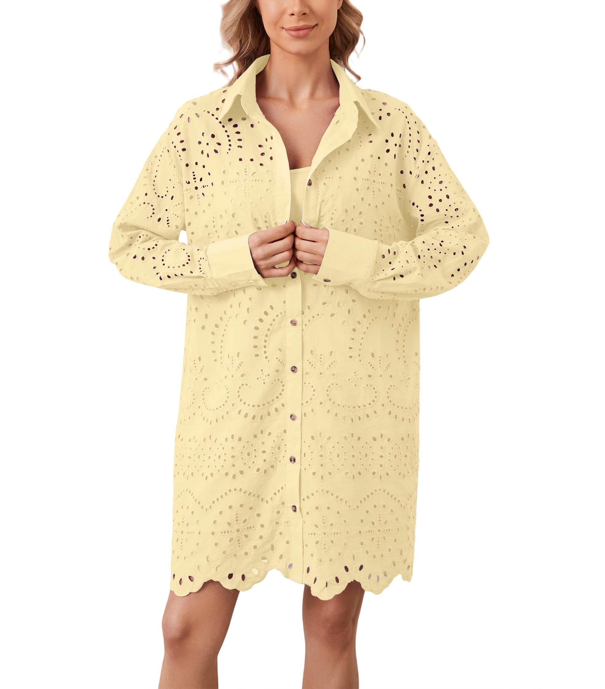 Turn heads with this stunning mini shirt dress, featuring a unique hollow-out design and a flattering loose fit. The button-down front and lapel collar add a touch of sophistication, making it perfect for both casual outings and special occasions. Embrace effortless style and comfort in this versatile piece that pairs beautifully with your favorite accessories.