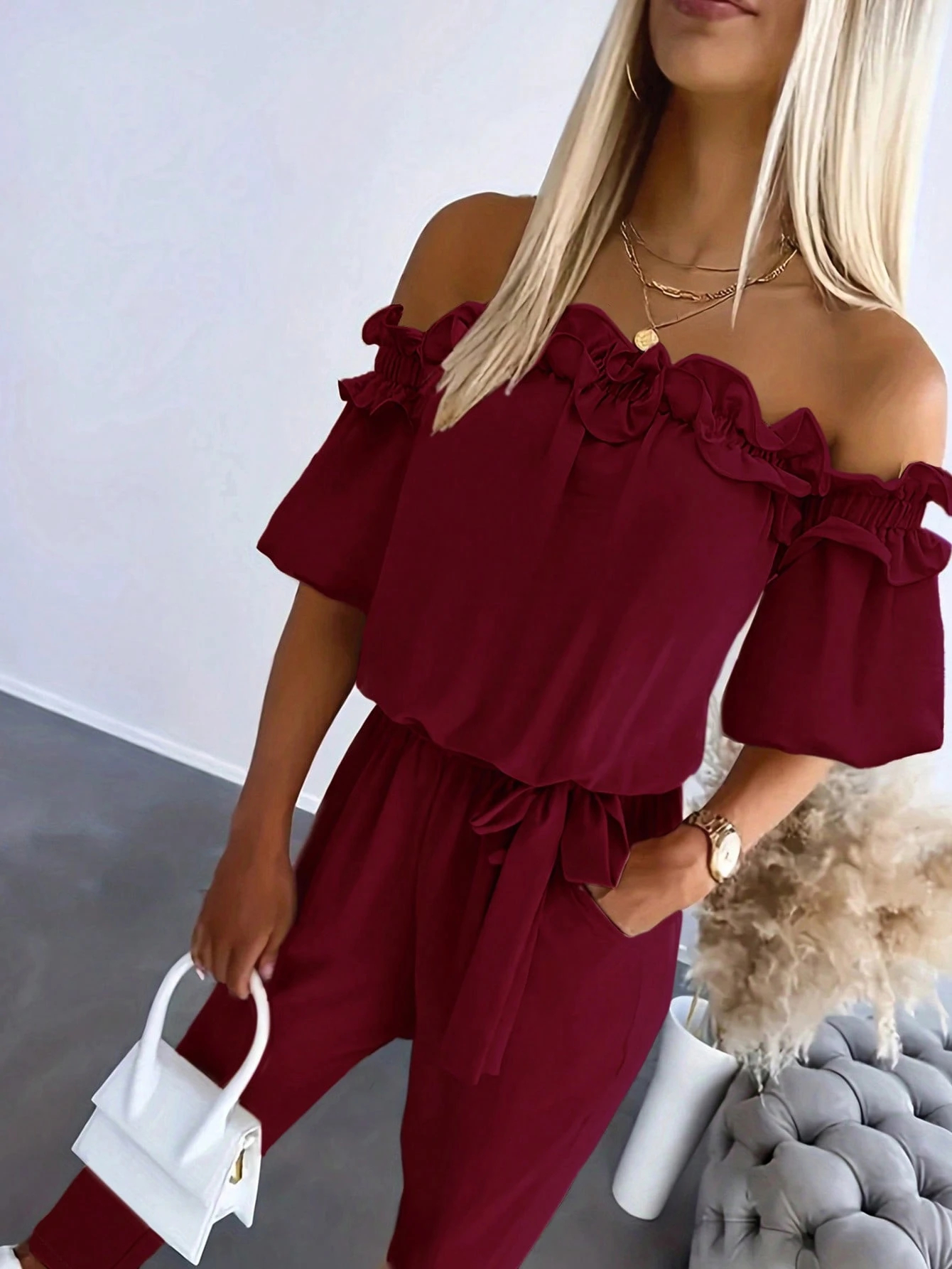 Discover effortless chic in this off-shoulder jumpsuit designed for day-to-night ease. The gently ruched neckline sits securely on your shoulders, creating a flattering silhouette, while the adjustable tie waist defines your shape without sacrificing comfort. Relaxed yet refined, the wide-leg cut flows beautifully and features convenient side pockets for a casual touch.
