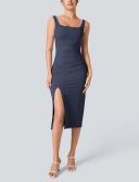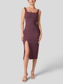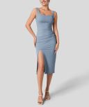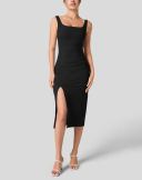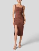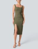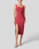 Women's Square Neck Backless Corset Ruched Split Bodycon Midi Casual Dress