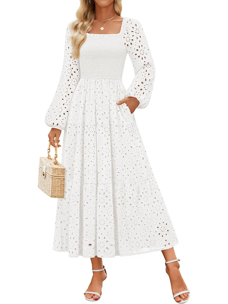HOT SALE Women's Square Neck Hollow Out Eyelet Smocked A Line Long Sleeve Dress