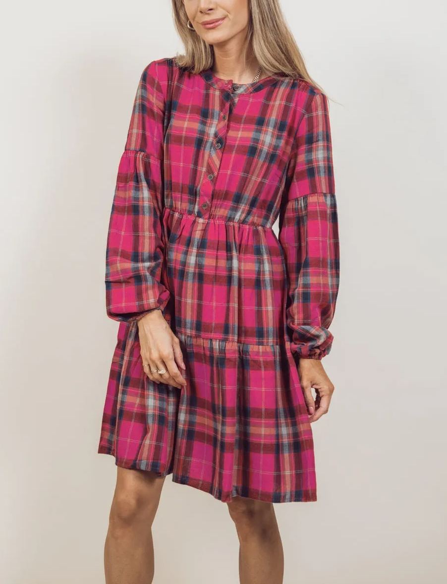 This delightful piece features a classic plaid pattern that never goes out of style. The dress is designed with a flattering A-line silhouette and button-down front, adding a touch of vintage elegance. The long, billowy sleeves with elastic cuffs provide a comfortable fit, while the tiered skirt adds a playful touch. Made from soft, breathable fabric, this dress is perfect for both casual outings and special occasions.