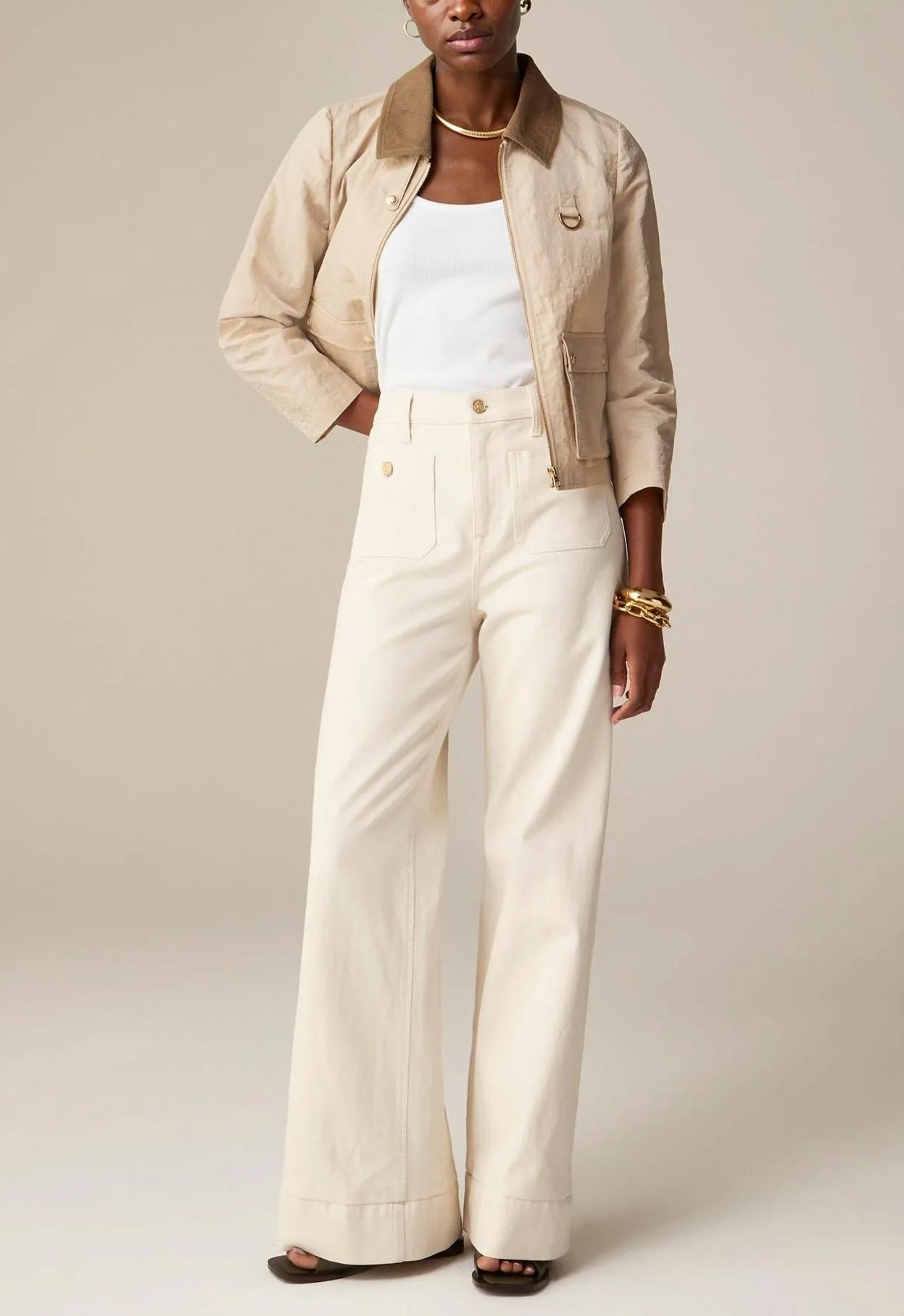 Our best-selling denim trousers, are refreshed with nautical details! This pants comes with a high rise and a full-length leg, plus patch pockets and our signature gold crest button details for added drama.