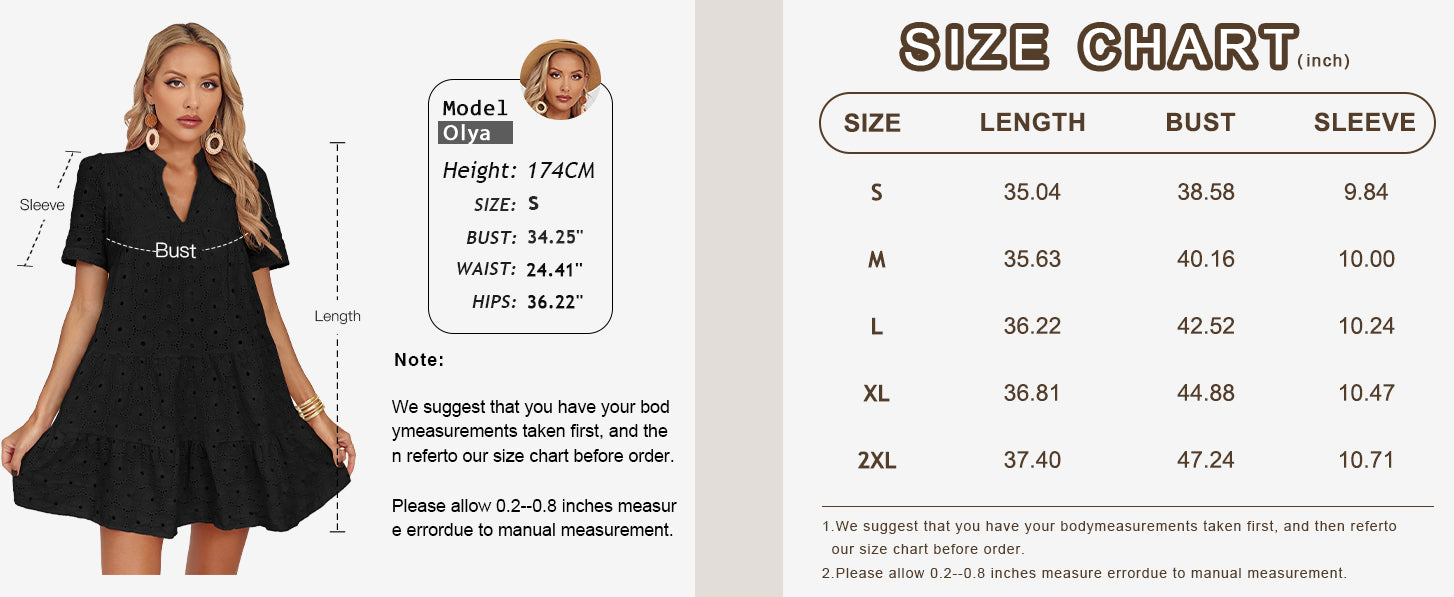 Women’s summer lace eyelet babydoll dress, V-neck short sleeve, flowy swing fit, casual and sweet, perfect for daily wear.