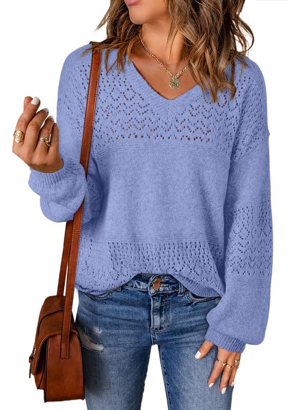 Womens Casual Long Sleeve V Neck Lightweight Crochet Pullover Sweater