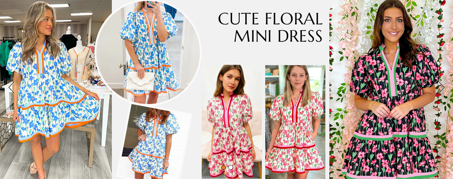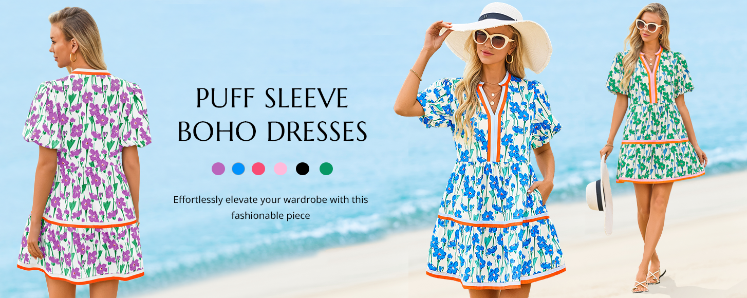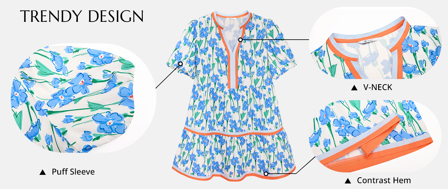 Casual summer floral mini dress! V-neck, puff sleeves, patchwork boho style. Soft, comfy and easy to match for daily chic looks.